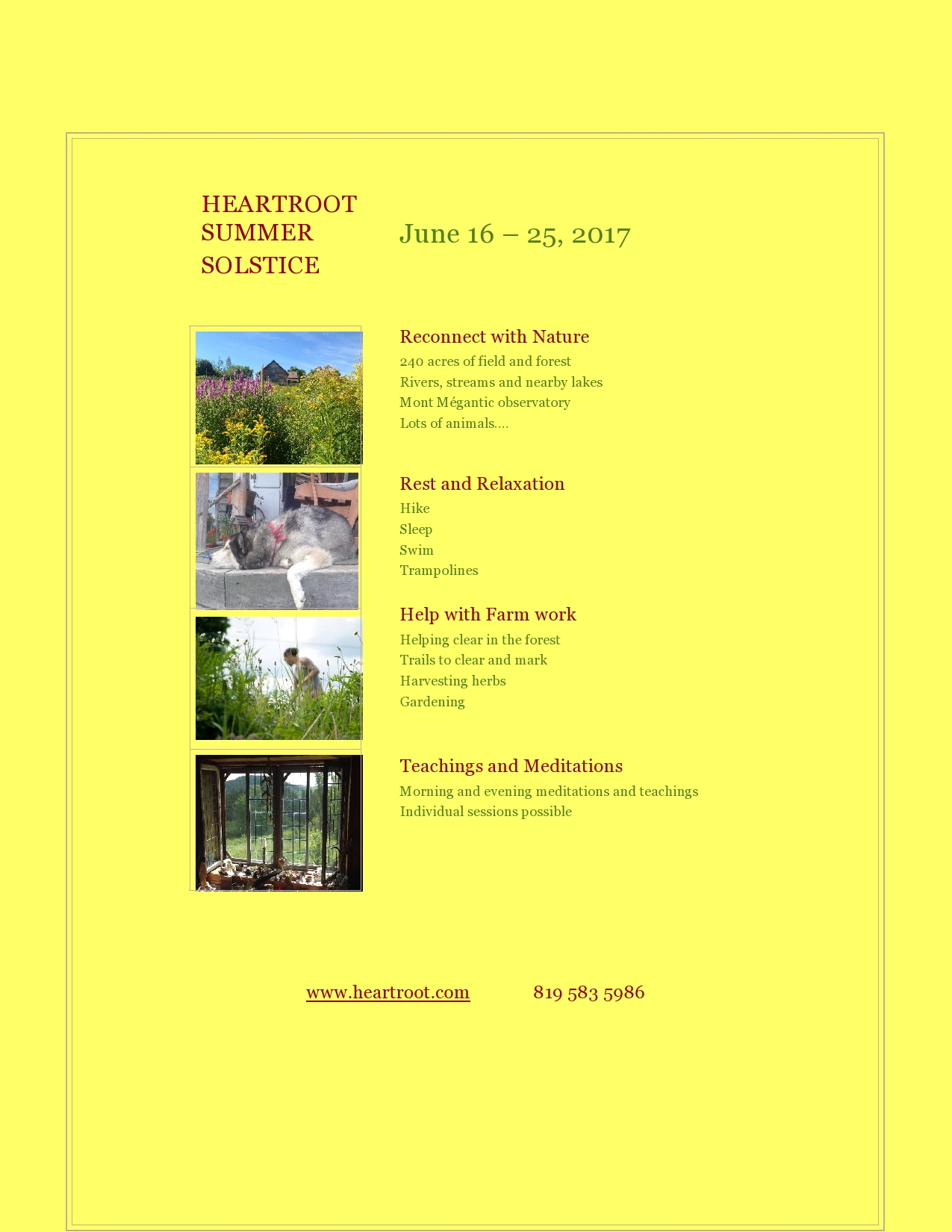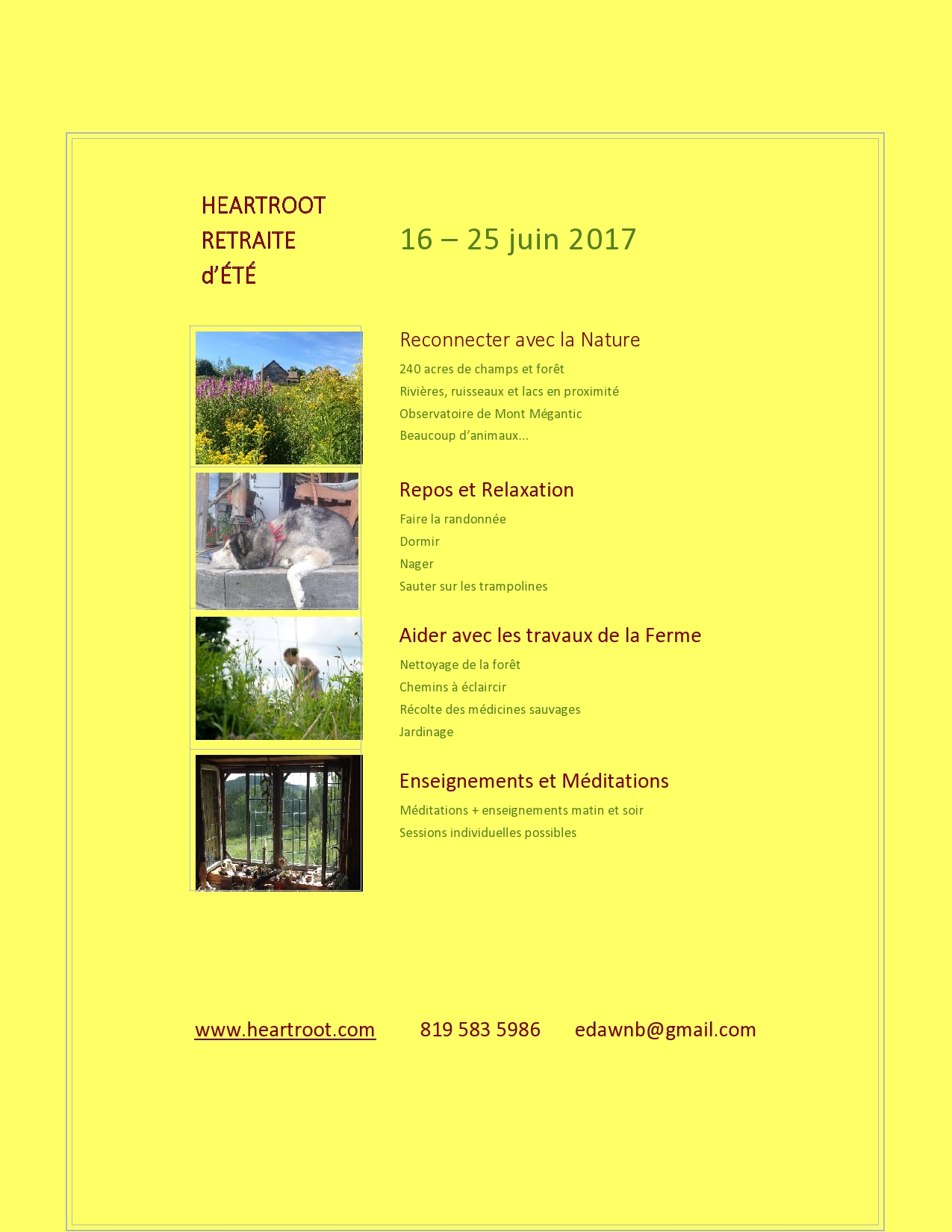 « All Events This event has passed. Retraite pour le solstice d’été/Summer Solstice Retreat/Retiro de solsticio de verano June 18, 2017 @ 8:00 am - June 25, 2017 @ 5:00 pm « COURS #5 de 5: l’Élément Sol et la Porte du Centre Soil Element and the Centre Gate Guérir les Blessures Ancestrales » + Google Calendar+ iCal Export Details Start: June 18, 2017 @ 8:00 am End: June 25, 2017 @ 5:00 pm Venue Heartroot Farm 86 chemin Vallerand (Rang 6) St.-Hubert-de-Audet, Quebec G0Y 1A0 Canada + Google Map Phone: 8195835986 Website: http://heartroot.com
